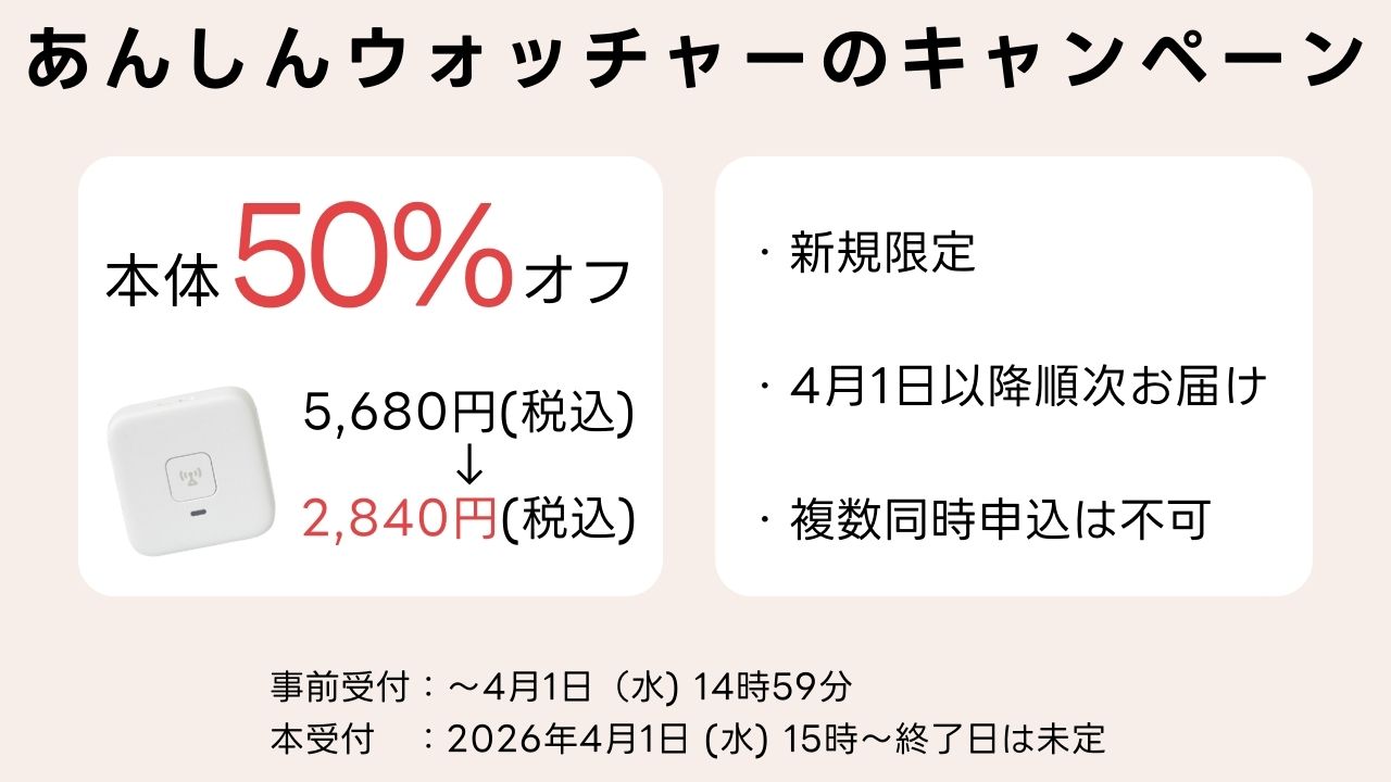 「あんしんウォッチャー」は期間限定で本体50%オフキャンペーンがスタートしました。