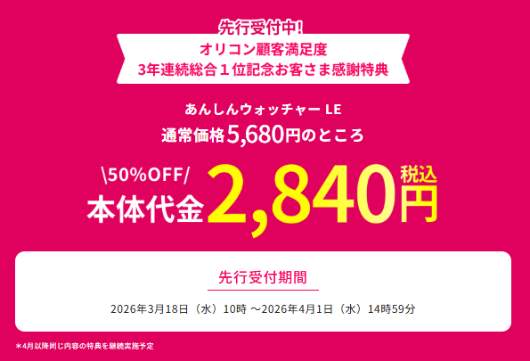 本受付期間:2026年4月1日 (水) 15時~終了日未定 - 対象:あんしんウォッチャーLEセットプラン新規購入