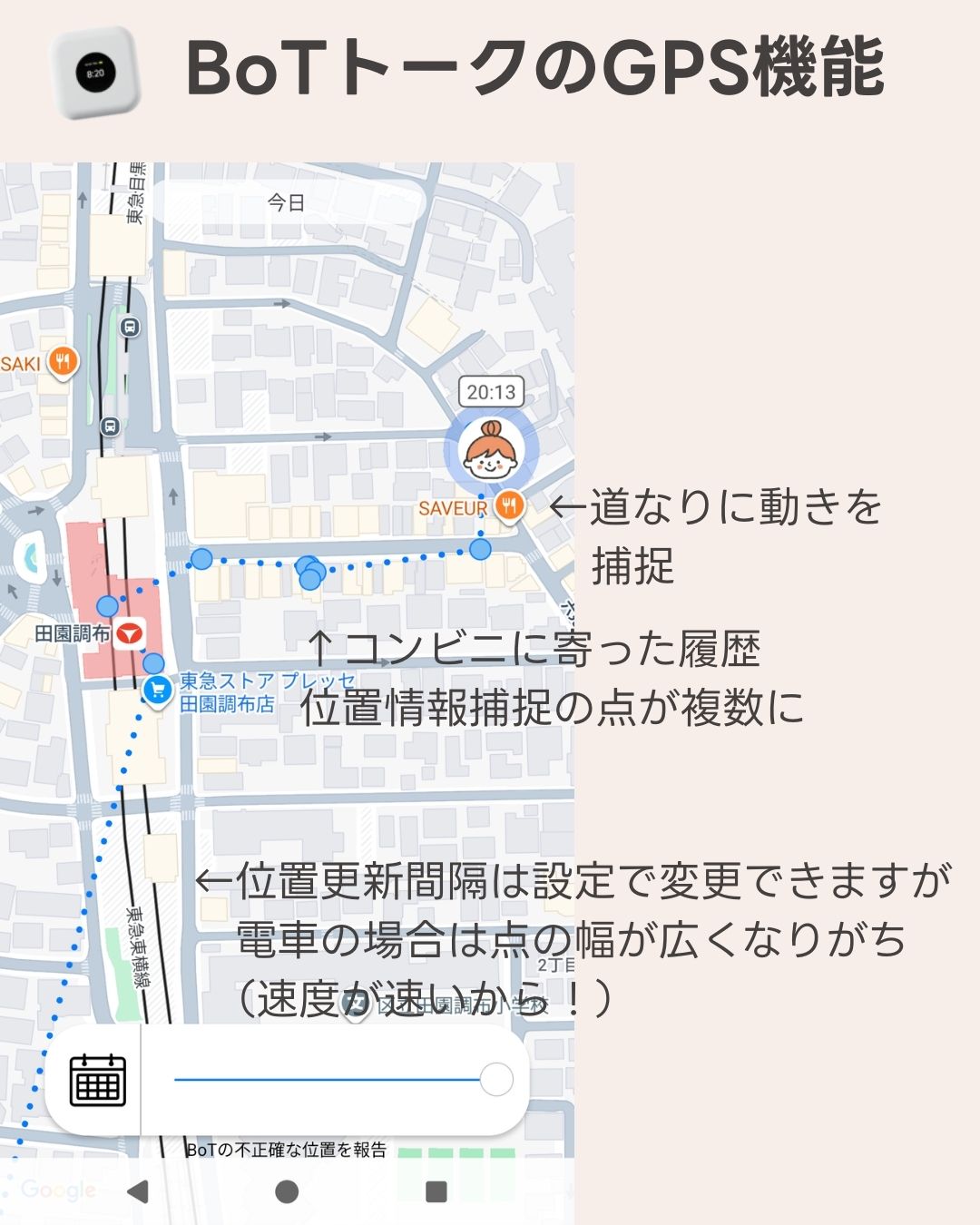 BoTトークはもちろんGPS機能もしっかり備えており、位置情報の取得によって移動履歴を確認できます。