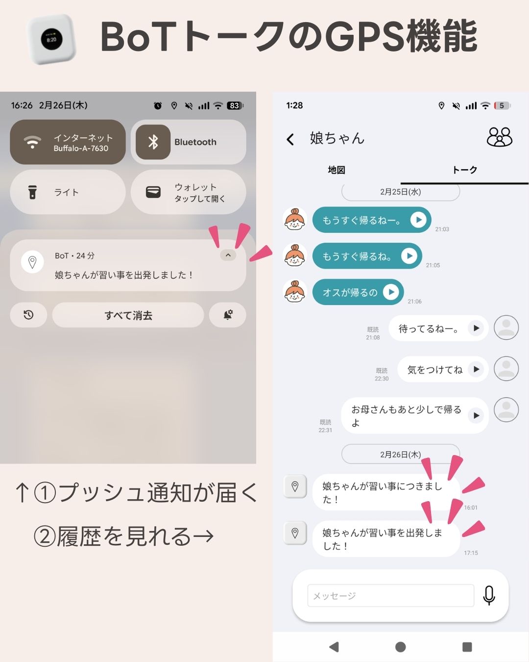 BoTトークは、通知スポットとして登録すると目的地へのIN・OUTをプッシュ通知で知らせてくれます。