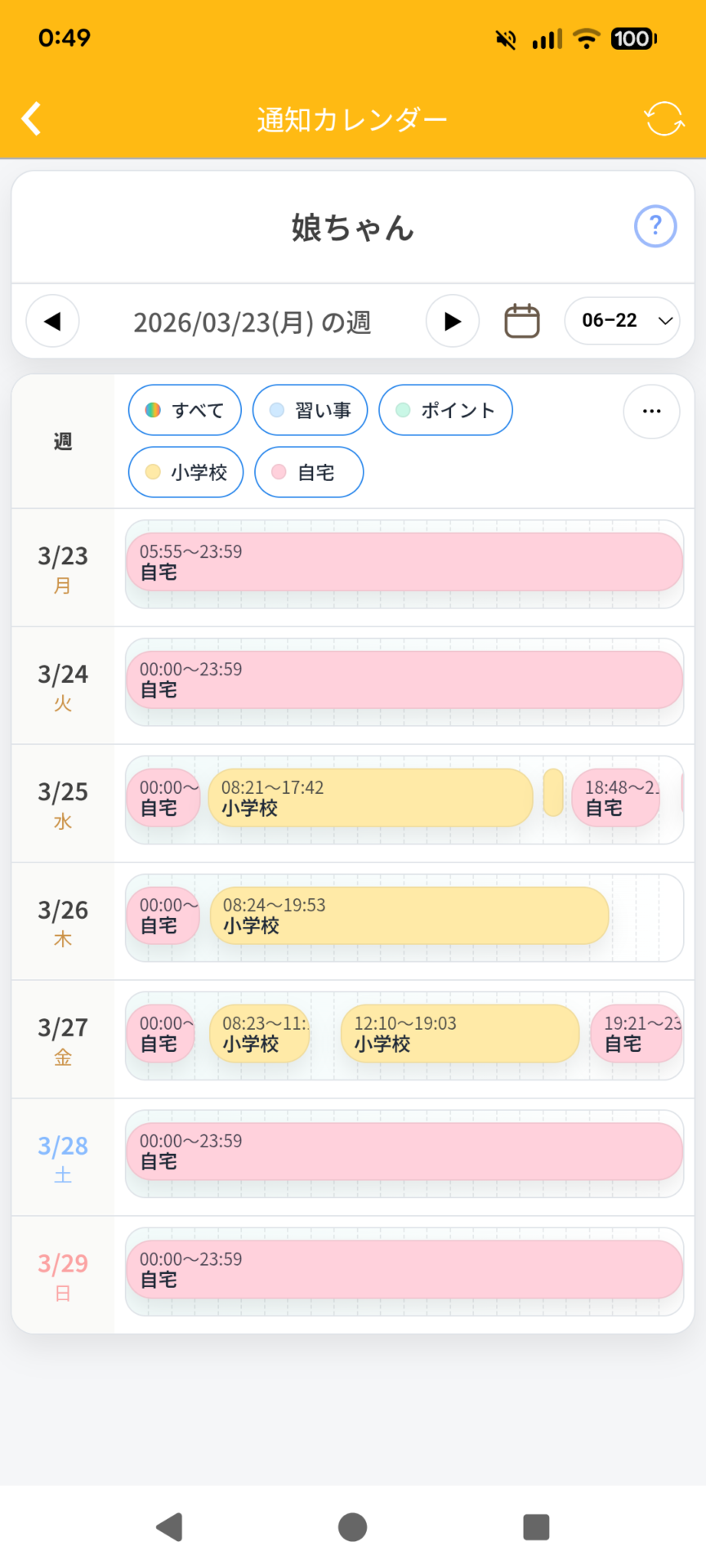 行動履歴をいちいち追わなくても、設定した見守りポイントの位置情報をもとに、登校時間や帰宅時間の変化が見える化されます。