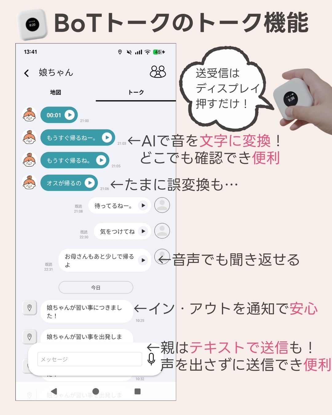 3.トーク・ボイスメッセージが送れる子供見守りGPSのポイント2つ