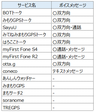 | 名称 | BoTトーク | みもりGPSトーク | SayuU | みてねみまもりGPSトーク | はろここトーク | myFirst FoneR2 |