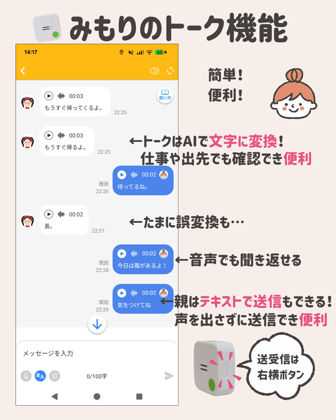 最新モデルは、最大30秒のボイスメッセージを親子で送受信できます。